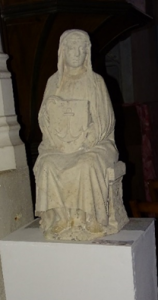 In the centre, a woman faces forward. Her feet are resting on a cushion, and she is sitting on a monumental carved chair. The seat cushion is shown in perspective. She was no doubt holding a child on her right knee. Her slightly wavy hair hangs loose on her shoulders. She was wearing a crown. Her dress has a close-fitting bodice, a draped belt around the waist, and a long, full skirt. On her shoulders she wears a coat which covers her knees, and creates folds on reaching the ground. At her feet, on the left, a man is sitting on a stool. He is carrying an almoner’s purse on his belt. On either side of the seat back, two angels are holding phylacteries (scrolls). They are slightly smaller than the other characters, and their wings are finely sculpted.